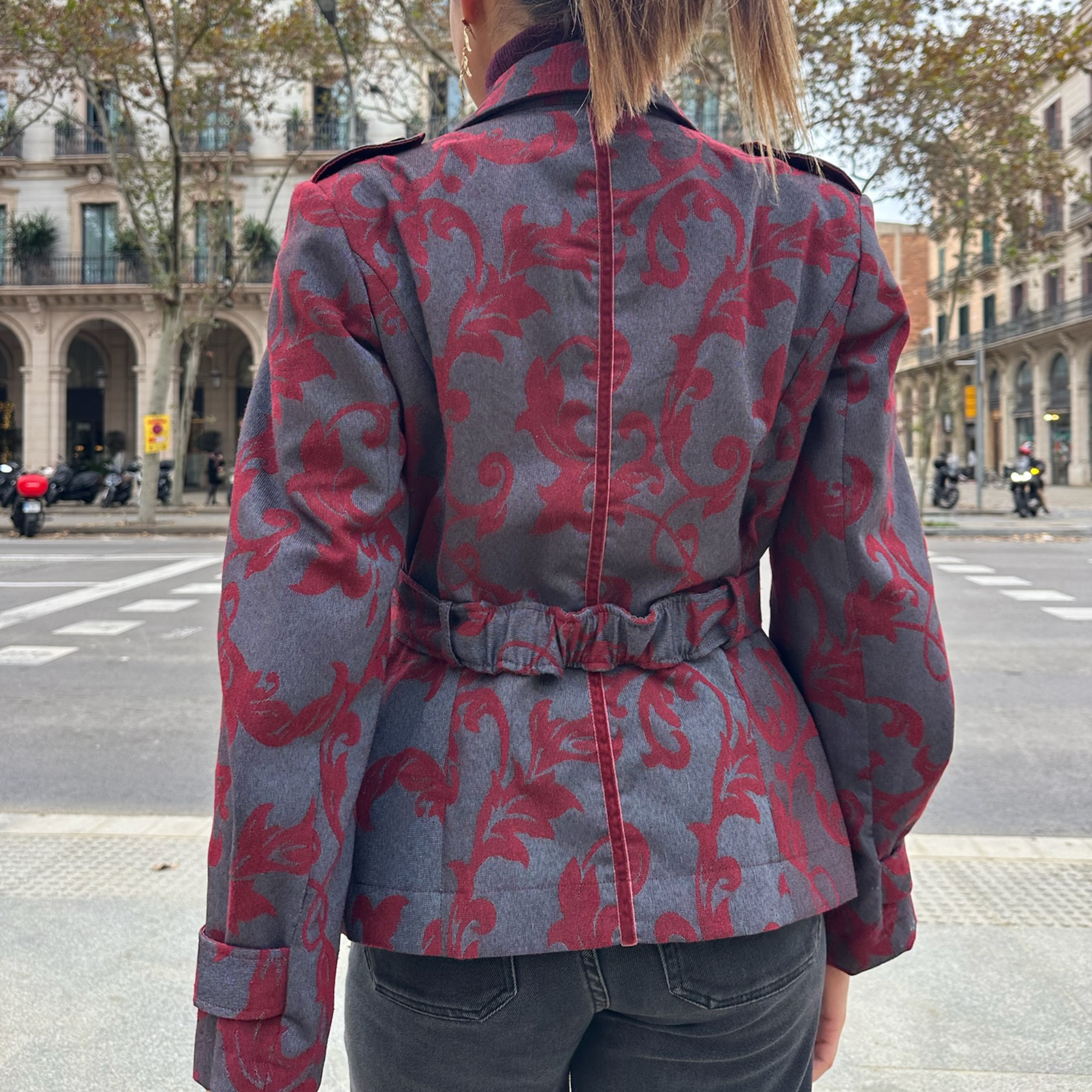 Motifs reminiscent of Baroque and Rococo tapestries and ceramics, in shades of burgundy and stone gray. A line of dusty burgundy velvet on the back gives the jacket its distinctive character.